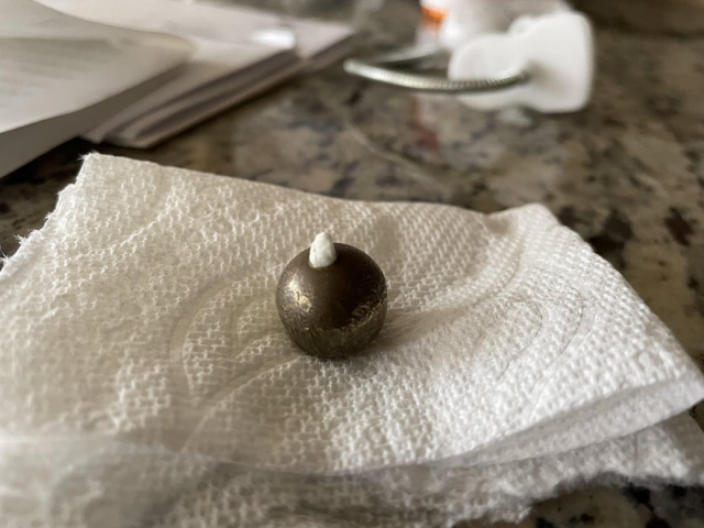 5. Маленький металлический шарик, найденный в кармане куртки моего старшеклассника. Внутри застрял восковой кусочек