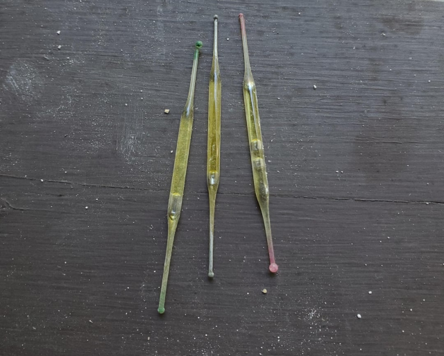 8. Нашёл под раковиной в ванной во время ремонта. Они маленькие, около 5 см длиной. Маленькие стеклянные трубочки, наполненные жидкостью