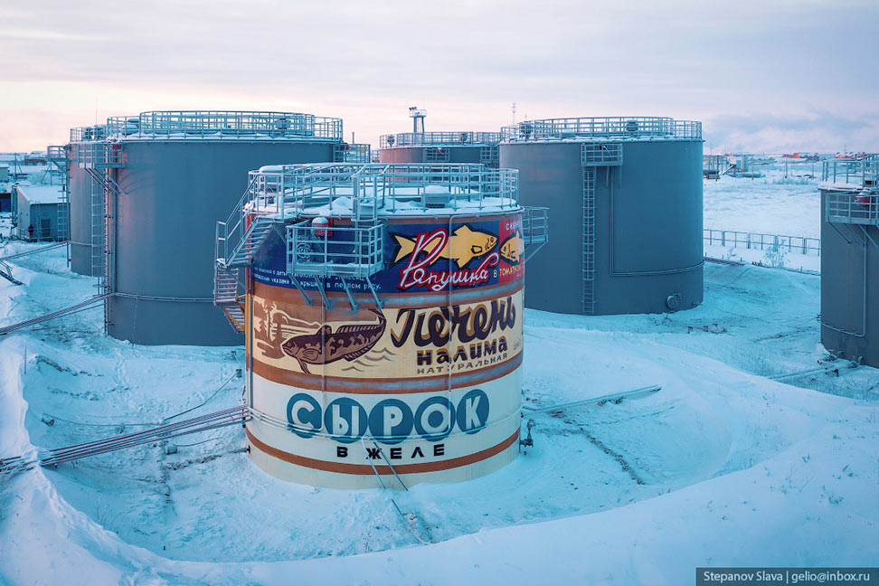 Разбавим летний зной прохладой. Салахард. Один из муралов изображает легендарные ямальские консервы — «Ряпушка», «Печень налима», «Сырок в желе». Мурал выполнен на резервуаре «Салехардэнерго».