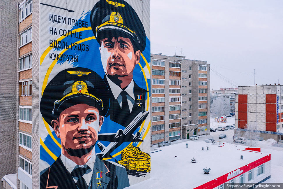 Фотографии и текст Славы Степанова 1. Сургут. «Идём правее на солнце вдоль рядов кукурузы» — сказал пассажирам командир Airbus A321 Дамир Юсупов после аварийной посадки самолёта в кукурузном поле под Жуковским 15 августа 2019 года. Менее чем через месяц после этого события граффити с этими словами появилось на 9-этажке по адресу проспект Мира, 34а в Сургуте.