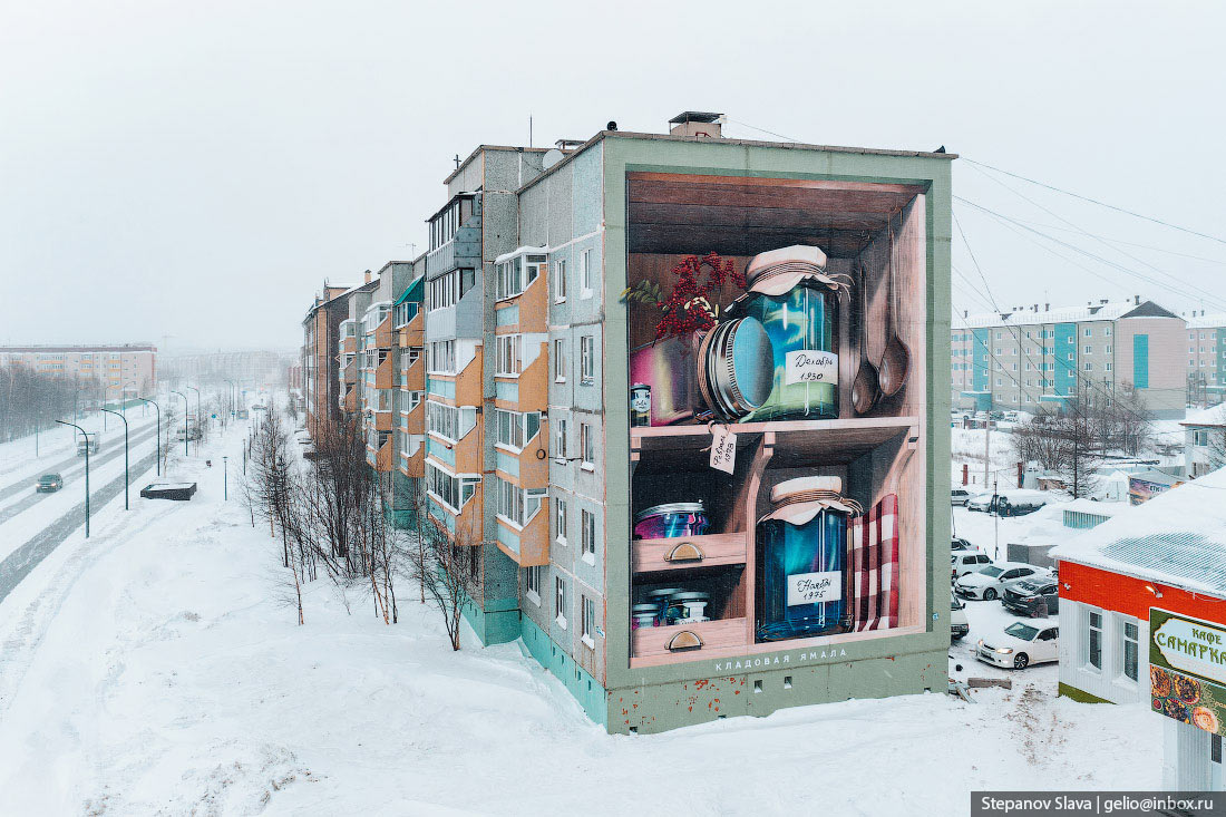 2. Надым. Мурал «Кладовая Ямала» в 2022 году занял первое место на фестивале уличного искусства. Это 3D работа в виде кладовой с банками, в которых спрятано северное сияние. Даты на банках неслучайные: в 1930 году образовался ЯНАО, в 1975 году основали Ноябрьск, а в 1978 году в городе родился первый ребёнок. На работу ушло около 11 дней.