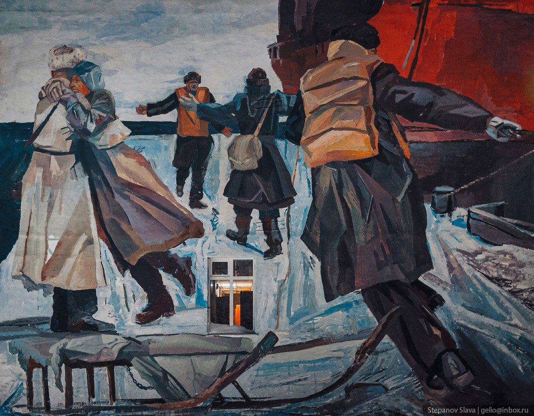3. Тикси. Гидрографическая база «Росатом». Мурал «Место встречи» на стене здания новый — он появился в 2023 году при поддержке Росатома. Его автор — художник Илья Федотов из Нижнего Тагила. Сюжет прост и близок к тиксинским реалиям: в посёлок прибывает рейс с важным грузом, но ещё важнее оказывается момент встречи с близкими людьми, которых герои мурала долго не видели из-за продолжительной непогоды.