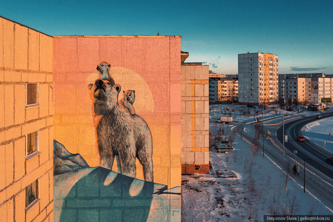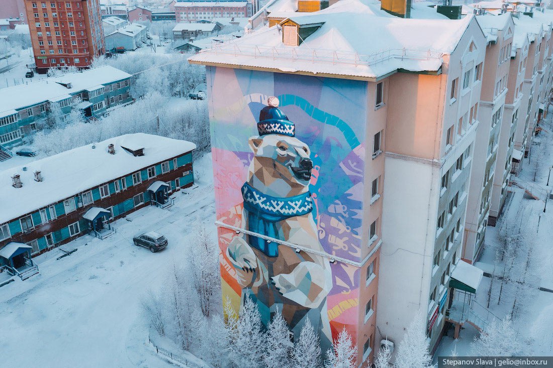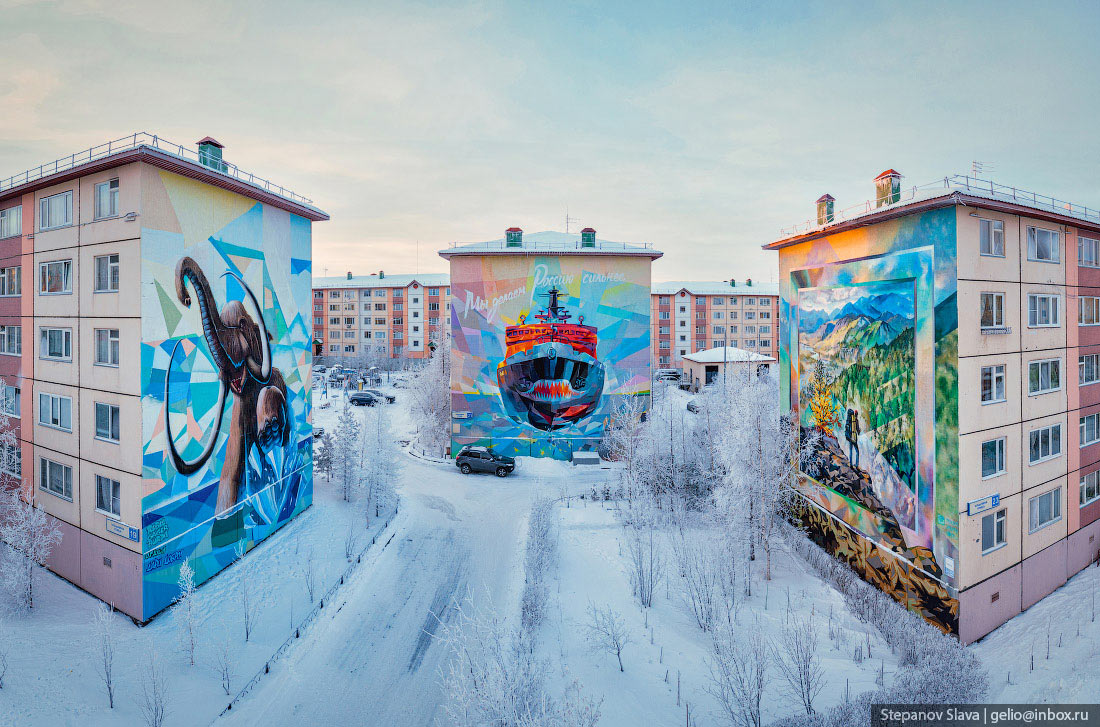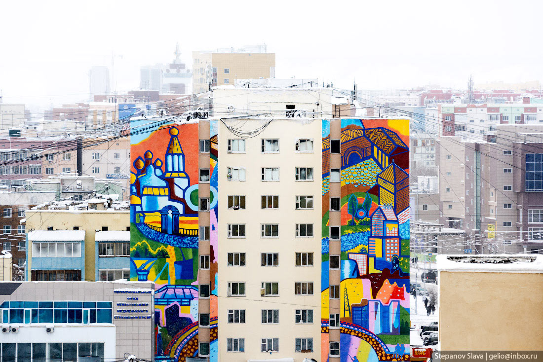 7. Якутск. Летом 2016 года молодые якутские художники Кыыдаана Игнатьева и Андрей Степанов раскрасили четыре дома в Якутске на улицах Кирова и Ойунского. По словам авторов, их граффити-акция (согласованная, впрочем, с городскими властями) стала вкладом в борьбу с серостью и безликостью.
