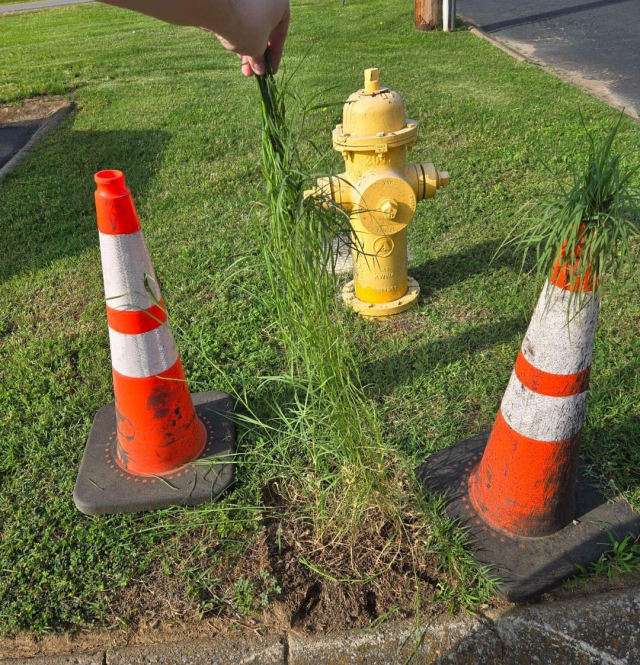 Нескошенная трава = глупая прическа для дорожных конусов