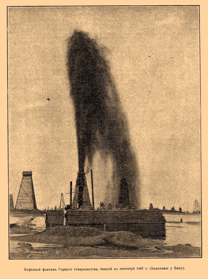 Нефтяной фонтан Горного товарищества, бивший в сентябре 1887 года (Балаханы у Баку). Раньше нефть часто добывали фонтанным способом. Сегодня таких легко добываемых углеводородов осталось очень мало / © Иллюстрация из энциклопедического словаря Брокгауза и Ефрона (1890-1907)