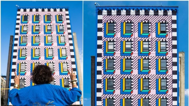 Фасад здания в стиле мемфис, который художница разрисовала в рамках фестиваля, Сансет-Парк, Бруклин