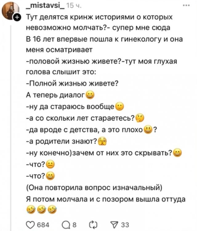 😬 Кринж-истории подписчиков 05/09/2025 17:00 У каждого есть момент «лучше бы забыть». Но люди решились — делятся фейлами, от которых хочется одновременно и смеяться, и закрывать лицо ладонью. Главная / Картинки 0 Admin 0 150