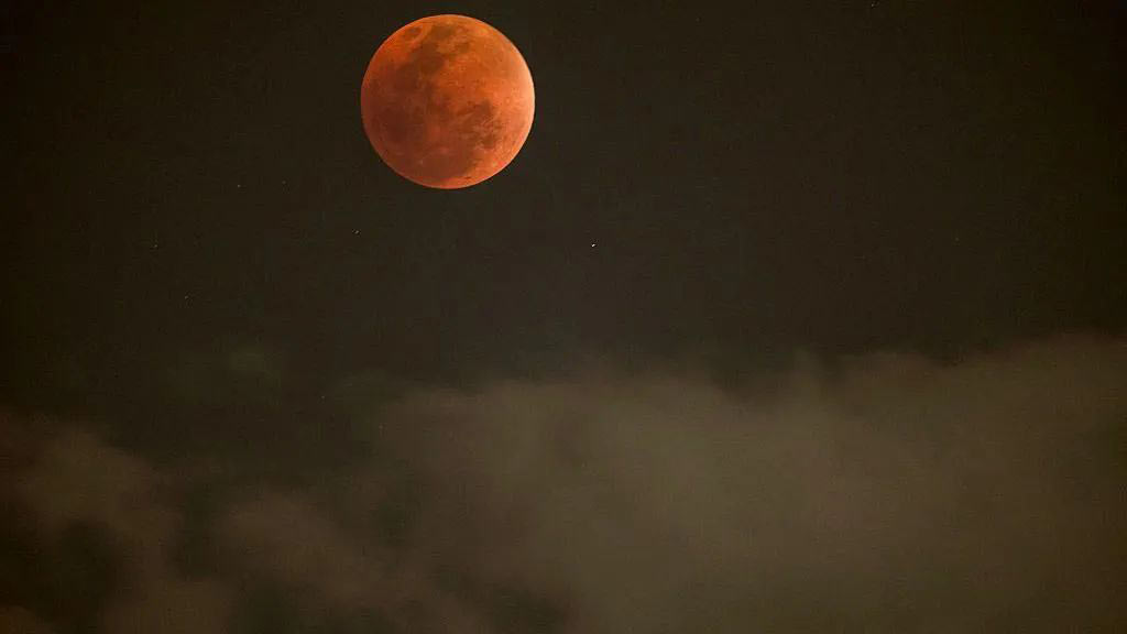 Кровавая Луна поднялась над облаками в Йоханнесбурге, Южная Африка: