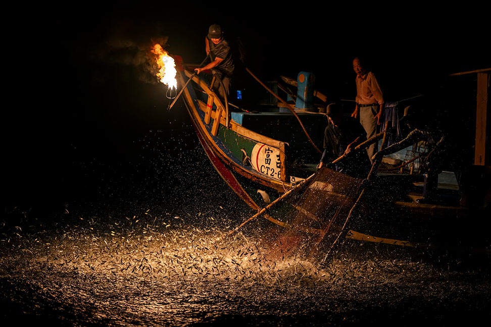 «Fuji 268, одно из последних рыболовных судов, использующих огонь для ловли рыбы, зажигает пламя, которое пугает мелкие виды сардин, которых они ловят в прибрежных водах Нового Тайбэя, Тайвань. В 2023 году Fuji 268 стало единственным судном, сохранившимся до наших дней, применяющим этот метод лова, являющийся национальным культурным наследием Тайваня. Команда стремится сохранить эту традицию, сотрудничая с туроператорами в этом регионе». (Фото © Sirachai Arunrugstichai / Ocean Photographer of the Year):