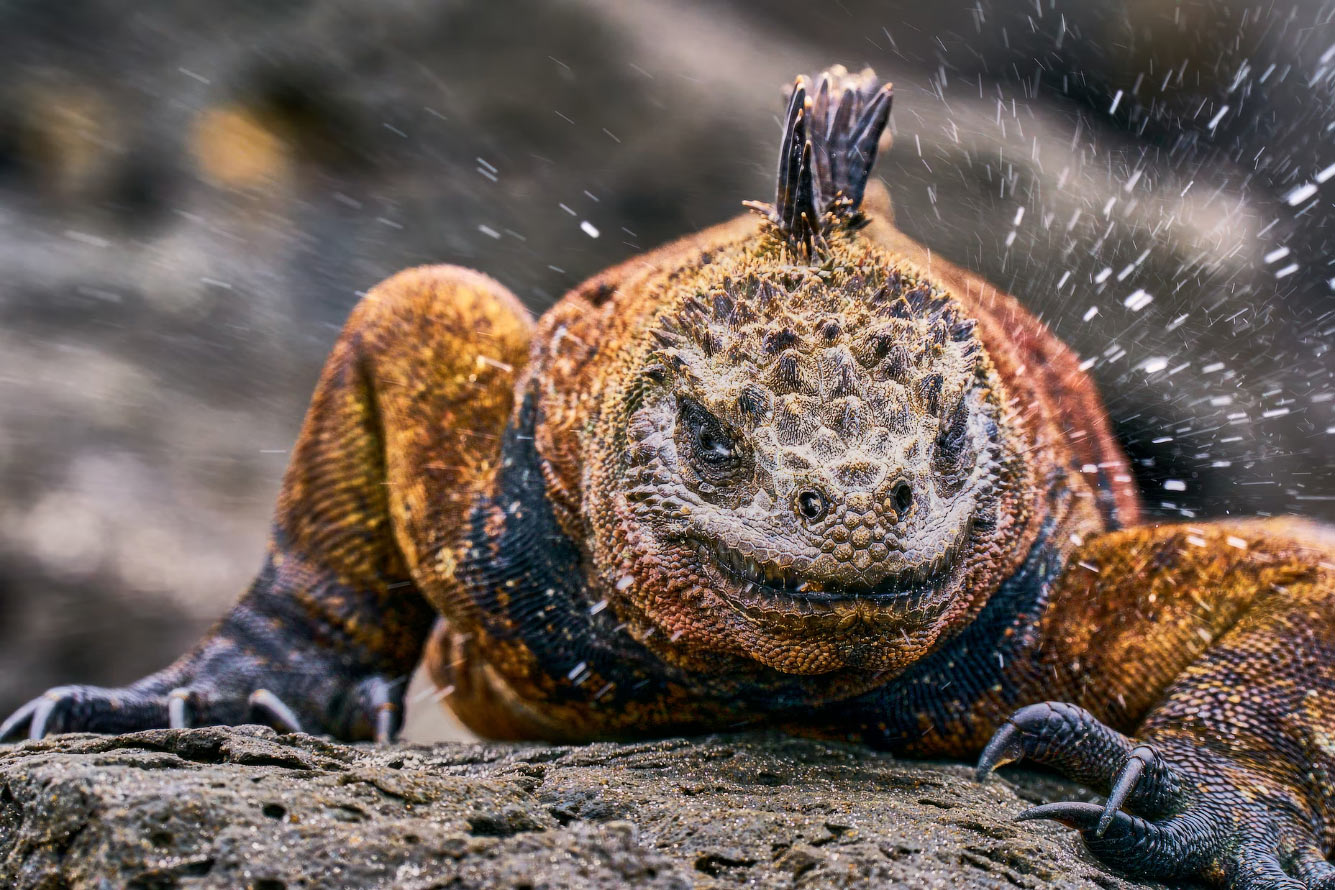 «Морские игуаны, эндемики Галапагосских островов, — один из самых знаковых видов архипелага. Они похожи на миниатюрных драконов, особенно на портретах, снятых с нижнего ракурса, глаза в глаза, как этот. Эта особь отдыхала на чёрных скалах острова Санта-Крус, загорая после погружения в поисках пищи. По счастливой случайности мне удалось сфотографировать момент, когда она чихнула, отбрасывая избыток соли, накопленный во время погружения». (Фото © Arturo de Frias / Ocean Photographer of the Year):