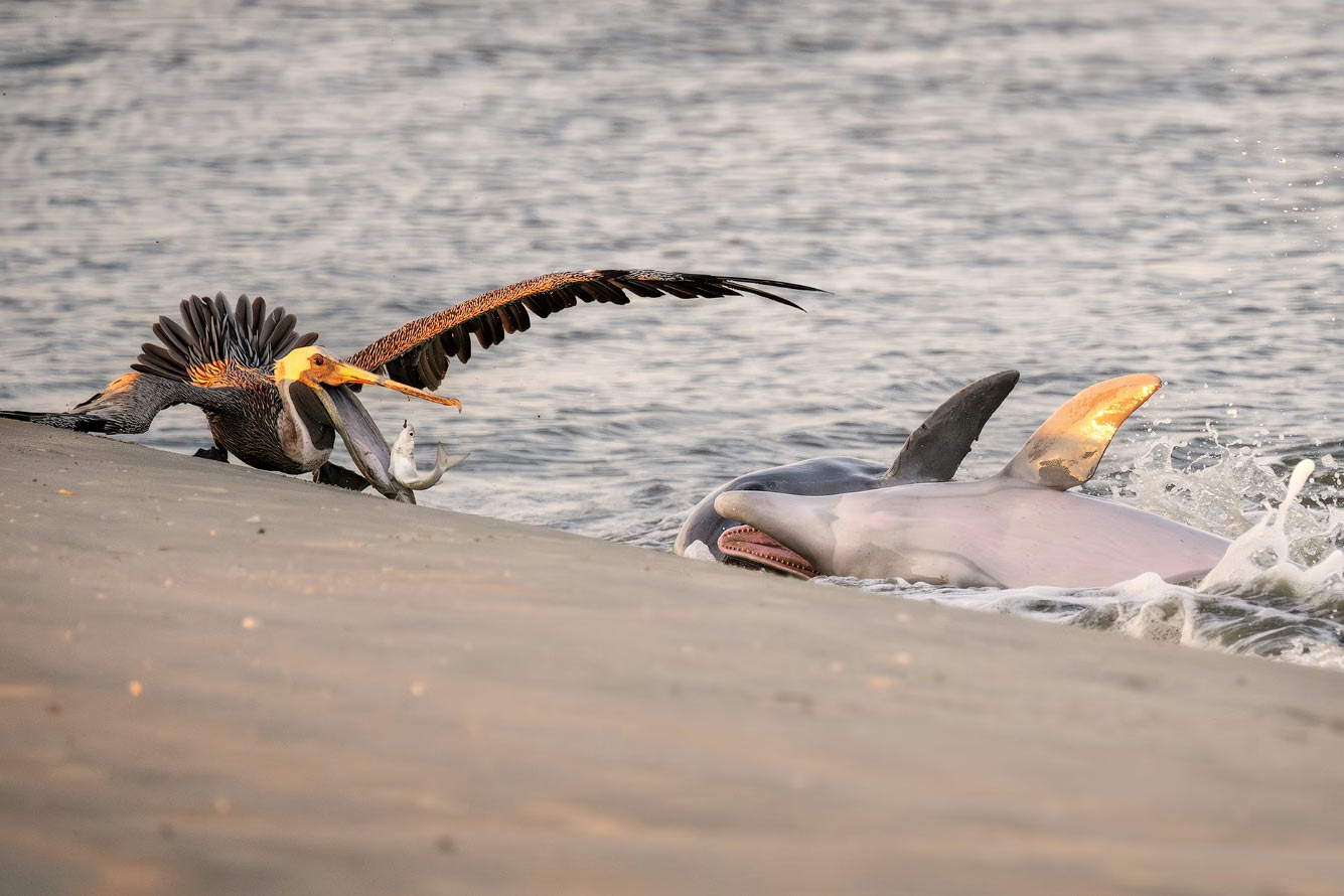 «Когда дельфины кормятся на берегу, они собирают комки рыбы и выбрасывают их на берег. Пеликаны обычно прячутся неподалёку, надеясь получить лёгкую добычу. Хотя Южная Каролина насчитывает около 350 дельфинов, это редкое поведение — кормление на берегу — характерно лишь для нескольких членов одной стаи». (Фото © Kat Zhou / Ocean Photographer of the Year):