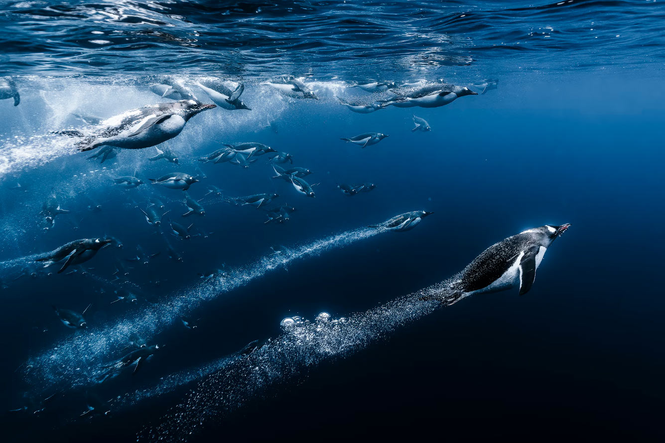 «Удивительно, как быстро папуанские пингвины способны построить колонию во время южного лета на Антарктическом полуострове. Порт-Шарко обычно является хорошим местом для этого. Эта защищённая бухта, окружённая горами и айсбергами, — идеальное место для папуанских пингвинов. Мы три дня стояли на якоре в этой бухте, недалеко от колонии. Каждый день мы заходили в воду, чтобы полюбоваться этими чрезвычайно любопытными птицами, которые так много раз прилетали к нам. Неуклюжие на суше, эти птицы быстрые и ловкие в воде». (Фото © Romain Barats / Ocean Photographer of the Year):