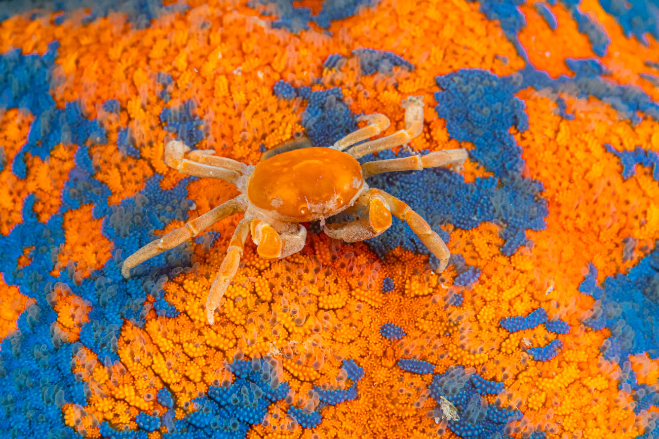 «Я ныряю в районе бухты Рудная уже более 40 лет, но никогда не видел горошинового краба. Мне повезло. Горошиновые крабы проводят большую часть жизни внутри раковин серых мидий, и этот симбиоз заканчивается только со смертью мидии или краба. Могу лишь предположить, что этот горошиновый краб искал себе дом, когда мне удалось его сфотографировать». (Фото © Andray Shpatak / Ocean Photographer of the Year):