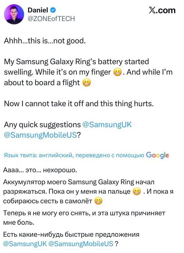 📱 Кольцо от Samsung чуть не оставило парня без пальца 01/10/2025 20:08 Аккумулятор во «всмарт-колечке» вздулся и намертво зажал палец. Его даже в самолёт не пустили — боялись взрыва. Спасли врачи, но парень решил: «Хватит с меня умных девайсов». Главная / Картинки +1 Admin 0 126