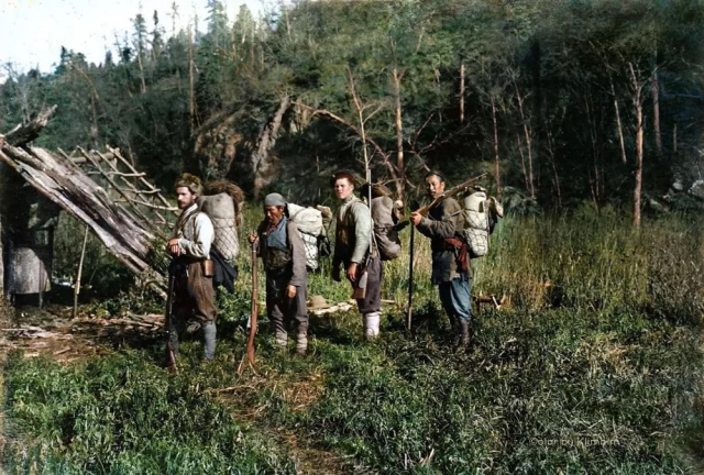 11. Владимир Арсеньев, Дерсу Узала, солдат Фокин и Чжан Бао (слева направо) в походе по бассейну реки Такема. Фотография из экспедиции 1907 года.