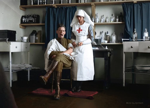 8. Русская медсестра делает инъекцию британскому солдату, Первая мировая война 1914 - 1918