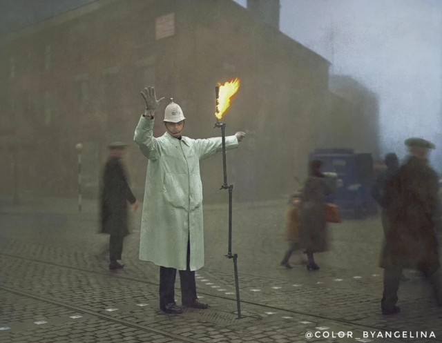 9. 1935 год, Лондон: газовый факел помогает полицейскому регулировать движение в лондонском тумане