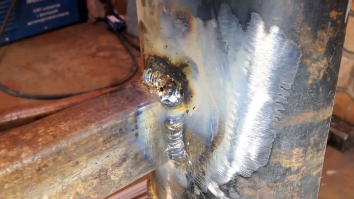 В этом случае электрод с зажженной дугой держим на толстом металле несколько дольше, чтобы образовалось побольше жидкого металла и только после двигаем электрод поперечно в сторону тонкого металла. Также после завершения сварки отбиваем шлак и чистим шов.