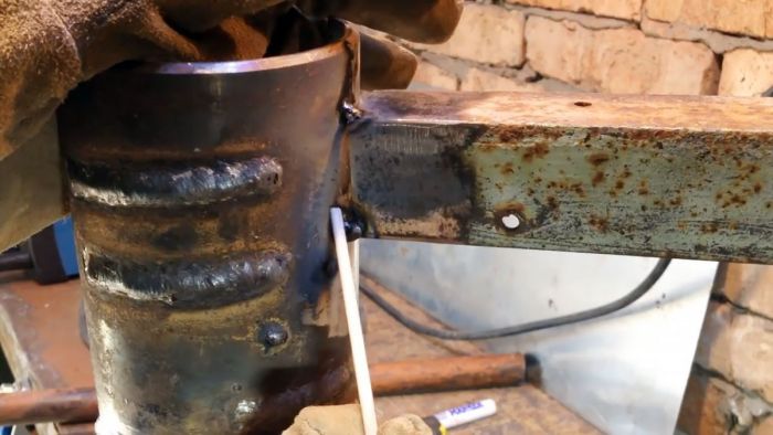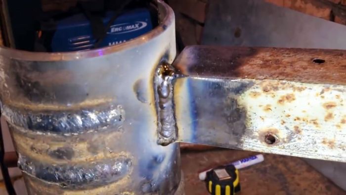 Зачищаем поверхность толстостенной трубы до блестящего металла и прихватываем прямоугольный профиль к трубе. Варить лучше электродами АК-53-70 или АК-46 с основным или рутиловым покрытием.