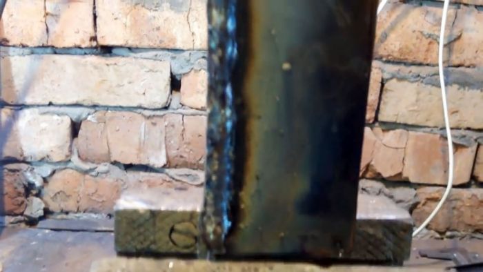 Наложив сварочный шов с одной стороны профиля, отбиваем с помощью молотка образовавшийся при сварке шлак и зачищаем его металлической щеткой.