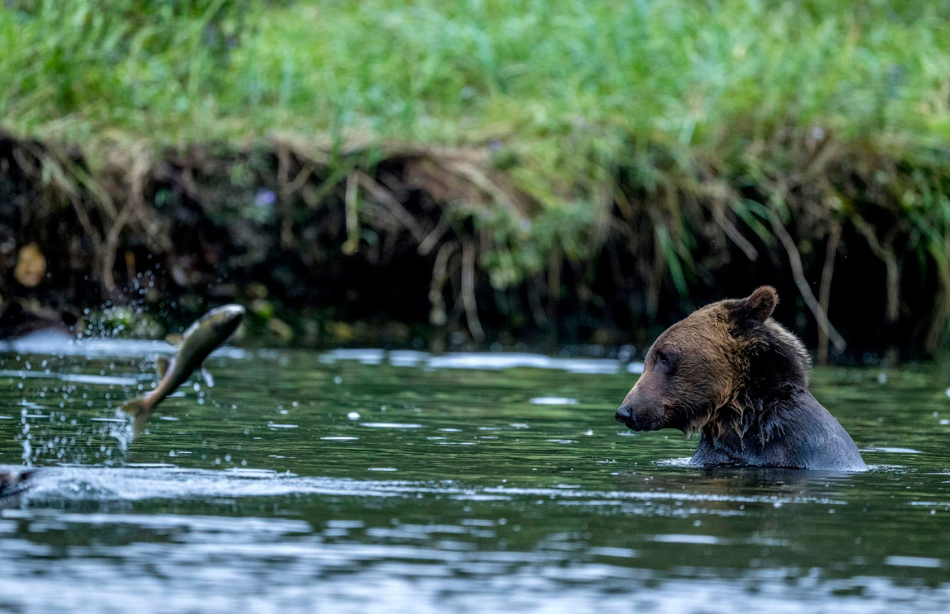 Бурый медведь охотится на лосося в устье реки в заливе Уинди, тропический лес Грейт-Беар, Британская Колумбия, Канада, 8 сентября 2025 года. (Фото Wolfgang Kaehler):