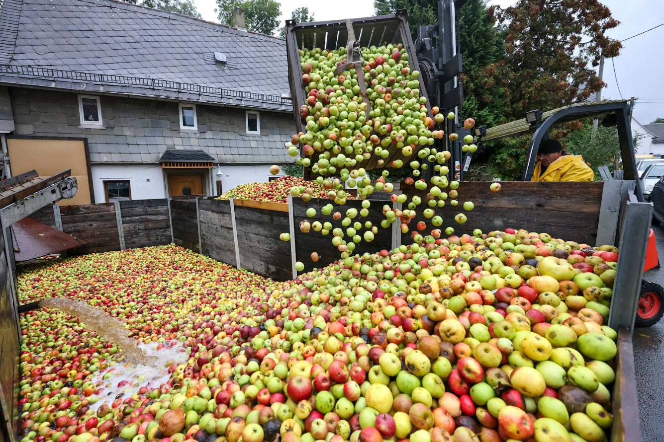 Яблоки высыпают из ящика на винодельне Mehlhorn в Лангенбернсдорфе, Германия, 22 сентября 2025 года после обильного урожая яблок. (Фото Jan Woitas):