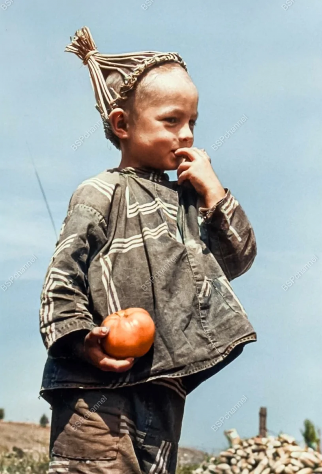 4. Мальчик держит помидор в колхозном поле. Украинская ССР, 1947 год.