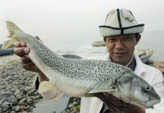 Ихтиолог Института биологии АН Киргизской ССР с форелью на берегу озера Иссык-Куль, 1981 год.