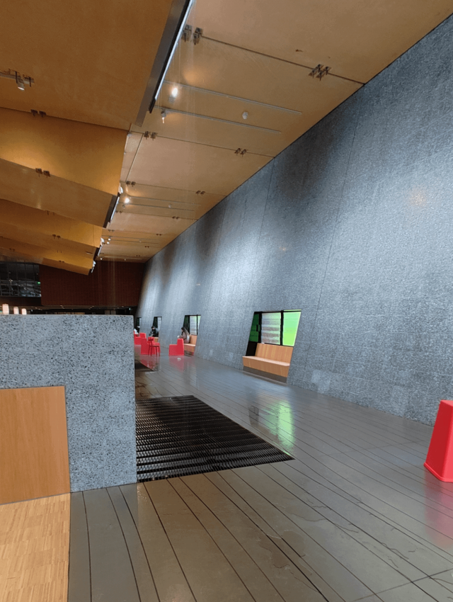 Крыша здания университета намеренно пропускает воду, которая разбрызгивается повсюду
