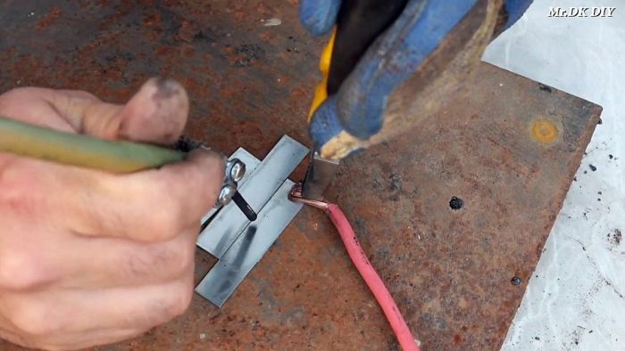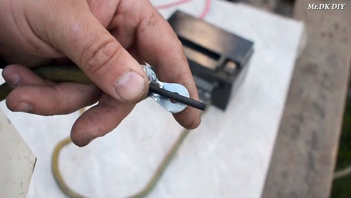 На второй конец плюсового кабеля ставится клемма. К ней прикрепляется графитовый стержень из батарейки. Его нужно крепко зажать, чтобы получить надежный контакт.