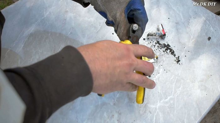 В качестве электрода для сварки будет применяться графитовый стержень из пальчиковой батарейки. Для этого ее нужно аккуратно разобрать бокорезами. Работать лучше в перчатках, чтобы не порезаться о корпус батарейки. В этом деле лучше не спешить, поскольку можно сломать стержень.