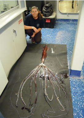 Абиссальная зона начинается с глубины 4000 м и доходит до 6000 м. Asperoteuthis (самый узкий кальмар) и колоссальные кальмары.