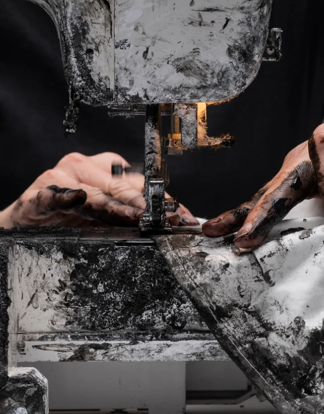 Чтобы уравновесить тяжелый принт, бренд использует читаемые, строгие силуэты. Рубашки с воротником, джинсы, пиджаки классического кроя, вещи с четко очерченными и узнаваемыми деталями. Затем текстильная краска закрепляется на волокнах, делая одежду пригодной для носки и стирки. Эта необычная техника соединяет дизайн, искусство и активизм, наглядно проявляя невидимый ручной труд.