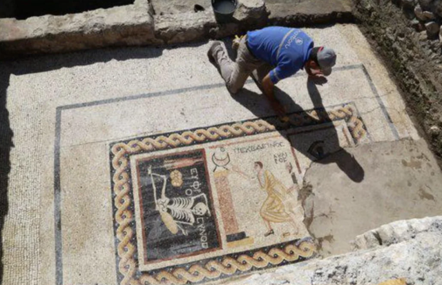 Мозаика, возрастом примерно 2 400 лет, найденная в древнем городе Антиохия на юге современной Турции, изображает лежащего скелета рядом с хлебом и винным кувшином, сопровождаясь надписью: «Будьте веселы, цените каждое мгновение жизни». Этот древний артефакт напоминает о бренности жизни и необходимости жить полноценно.