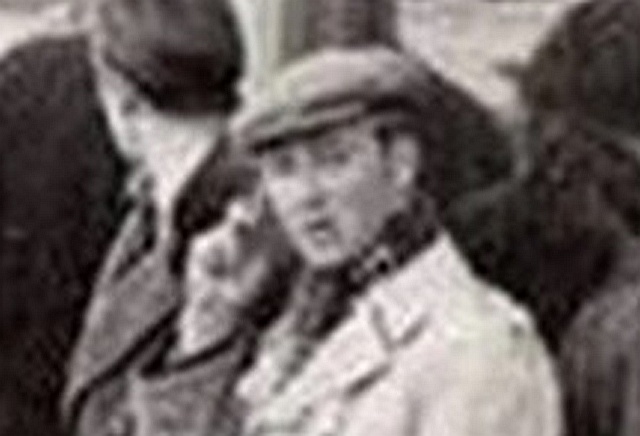 Среди них стоит мужчина в белом плаще, который явно выбивается из общей картины. Другой головной убор, другой шарф — и главное: он держит у уха плоский прямоугольный предмет, точь-в-точь как человек, разговаривающий по мобильному телефону.