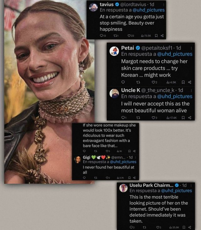 Нашлись и «эксперты» по уходу: Марго советовали срочно сменить косметику, удалить фото и уверяли, что «самой красивой женщиной мира её точно не назовёшь».