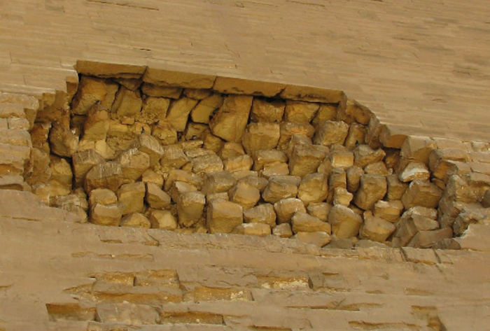 Пролом в облицовке сохранившейся части пирамиды. Внутри пролома наглядно видно, из чего она была построена.