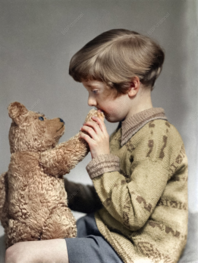 На знаменитой фотографии 1927 года запечатлены Кристофер Робин Милн — пятилетний сын писателя А. А. Милна — и его любимый плюшевый мишка, Винни-Пух. Игрушка была куплена в магазине Harrods в 1921 году и первоначально называлась просто «Медведь», но мальчик сам дал ей имя: «Винни» — в честь медведицы Винни (сокращённо от Winnipeg), которую он видел в Лондонском зоопарке, и «Пух» — так звали лебедя, который жил у знакомых семьи Милнов. Эти два имени слились в одно — Винни-Пух, а детские игры Кристофера Робина с его игрушками вдохновили отца на создание книги, ставшей классикой детской литературы.