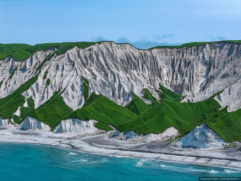 На Итурупе, самом большом острове Курил, есть очень живописное место — Белые скалы. Склоны у этих гор действительно белые, особенно в солнечную погоду. За тысячи лет на скалах появился слой зелёной травы, к подножию подступает серый, местами даже чёрный песок, а омывают побережье лазурные воды Охотского моря. Такое сочетание ярких красок сделало Белые скалы одной из самых запоминающихся достопримечательностей Курильских островов.