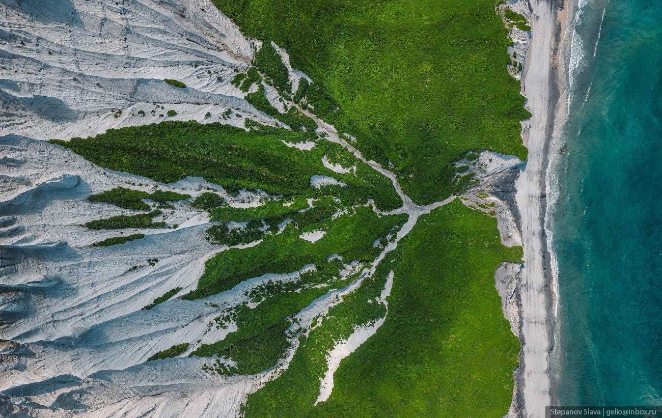 8. Итуруп — один из островов Курил, на котором живут медведи. Их здесь более 500 особей — за два года популяция увеличилась на 100 животных. На пляже возле белых скал часто попадаются медвежьи следы. 9. Пляж у подножия скал состоит из смеси белого кварцевого песка и черного титаномагнетитового песка, который притягивается магнитом.