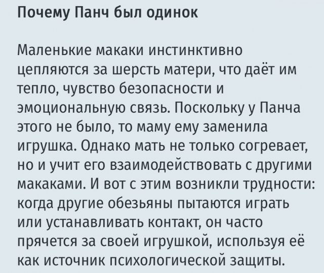 История малыша Панча, которого после рождения бросила мама, растрогала весь мир. Сотрудники японского зоопарка дали ему игрушечную обезьянку, и он стал носить её повсюду, считая своей мамой.