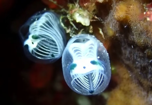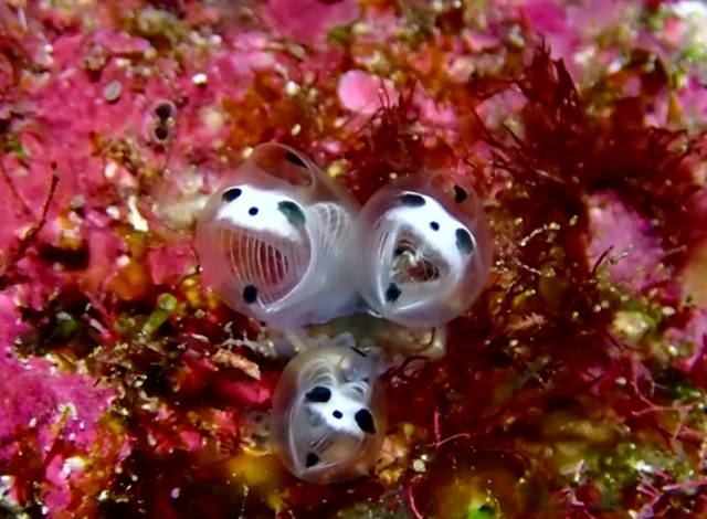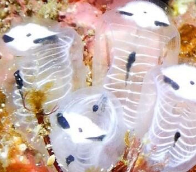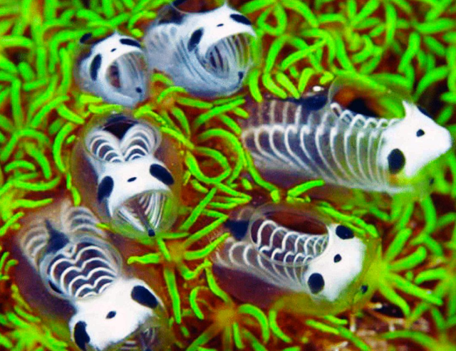 Clavelina ossipandae — прозрачное морское существо с «рёбрами» и пятнами, напоминающими мордочку панды. Выглядит как оживший скелет из фантастического фильма.
