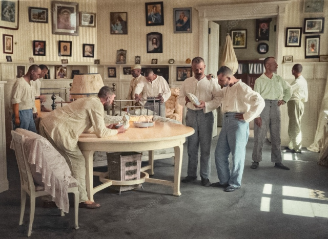 Открытие крестьянского курорта «Ливадия». Экскурсия отдыхающих по бывшему царскому дворцу: в царской спальне. Крымская АССР, г. Ялта, 1925 год.