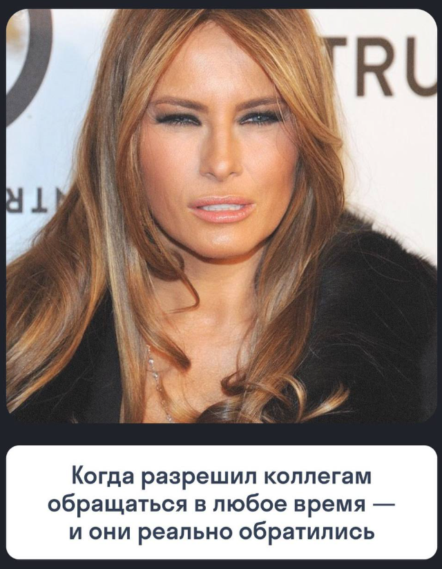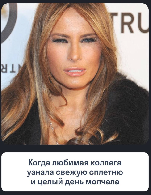 Мимика Мелании — это мы в офисе 24/02/2026 21:20 Мелания Трамп внезапно стала символом офисной жизни. Её выражения лица будто созданы для рабочих будней: от «опять это совещание» до «кто съел мой обед из холодильника». Особенно актуально после длинных выходных, когда возвращаешься в реальность. Главная / Картинки 0 Admin 0 122