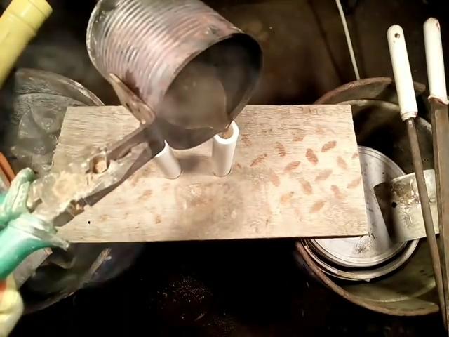 Далее необходимо приготовить полипропилен для плавки. Подойдут самые ненужные отходы из обрезков, бракованных фитингов или демонтированных устаревших сантехразводок. Для емкости для плавления подойдет отработанная герметичная посуда. Вставляем черенок инструмента и трубу в отверстия на деревянной станине. Можно сразу расположить несколько испытуемых экземпляров, регулируя глубину посадки черенка в рукоятке.