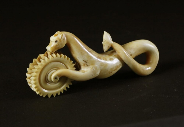 3. Фигурный ролик для пирогов «Морской конёк», сделанный китобоем из бивня нарвала, около 1850 года