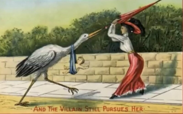 Карикатура, изображающая женщину, которая зонтиком отгоняет аиста, несущего ей новорождённого ребёнка. Подпись гласит: «А злодей всё преследует её».