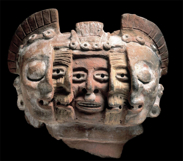 9. Три лица из обожжённой глины, олицетворяющие цикл жизни и смерти, из древней Мексики