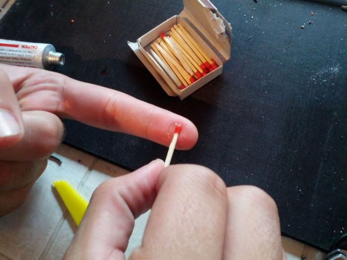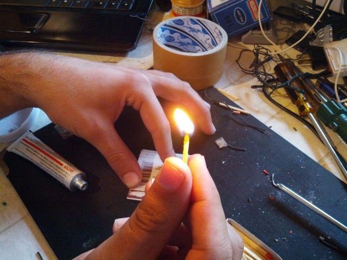 Эпоксидка делает более надежную герметизацию спичечной головки, чем свечной парафин, который также применяют для пропитки головок. Такой способ тоже простой. Нужно просто предварительно расплавить свечу и окунуть в нее спички.