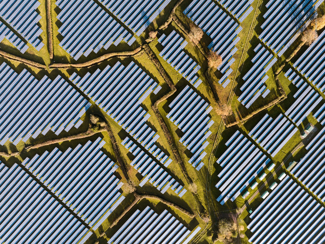 Солнечные волны. Ряды солнечных панелей тянутся по ландшафту, словно рябь на поверхности воды. Эта солнечная электростанция расположена на территории, окружающей деревушку Кембридж в Англии. Панели пришлось тщательно расположить, учитывая границы между пастбищами. В результате получился узор, напоминающий формы водоемов. Это изображение является частью проекта по документированию взаимосвязи между природой и промышленностью вдоль реки Северн, протекающей неподалеку от этой солнечной электростанции. (Фото © Francesco Russo / Wildlife Photographer of the Year):